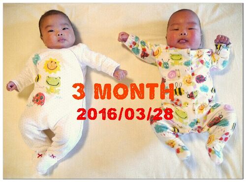 3/28で双子ちゃんが3ヶ月になりました♥ 早い早いー( *´艸`)♪ 双子ママの先輩方に「双子育児で一番辛かったのは生後2ヶ月までかなぁ」なんて聞いていたので、落ち着くことを期待していましたが、言われた通りずいぶん落ち着いてきた気がします('ω')♥ 息子♥ …